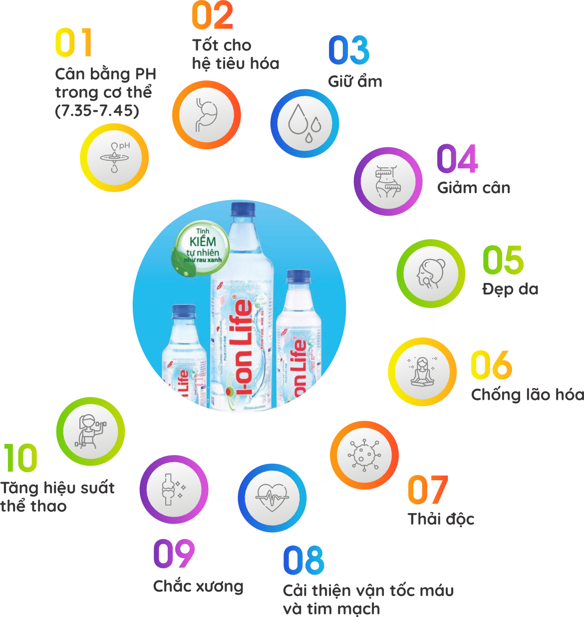 - Nước i-on Life có tính kiềm tự nhiên cao pH 8.5-9.5 giúp trung hòa axit dư thừa trong cơ thể, tốt cho hệ tiêu hóa, đặc biệt là có thể bù được chất điện giải trong quá trình luyện tập.